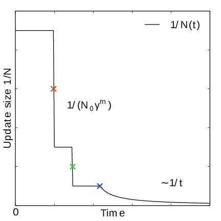 In the initial stage the update size is kept constant (by keeping \(N_n\) constant) until a transition across the sampling interval has been detected, a “covering”. For the definition of a covering, see (13) below. After a covering has occurred, \(N_n\) is scaled up by a constant “growth factor” \(\gamma\), chosen heuristically as \(\gamma=3\). Thus, in the initial stage \(N_n\) is set dynamically as \(N_{n} = \gamma^{m} N_0\), where \(m\) is the number of coverings. Since the update size scales as \(1/N\) ( (10)) this leads to a close to exponential decay of the update size in the initial stage, see Fig. 39.