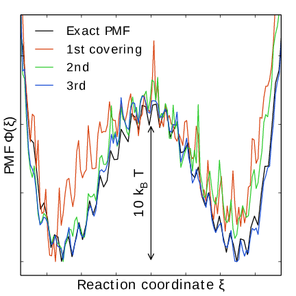 Note that quantity of interest to the user is not \(F(\lambda)\) but the PMF \(\Phi(\xi)\). \(\Phi(\xi)\) is extracted by reweighting samples \(\xi(t)\) on the fly 137 (see also section Reweighting and combining biased data) and will converge at the same rate as \(F(\lambda)\), see Fig. 39. The PMF will be written to output (see section Usage).