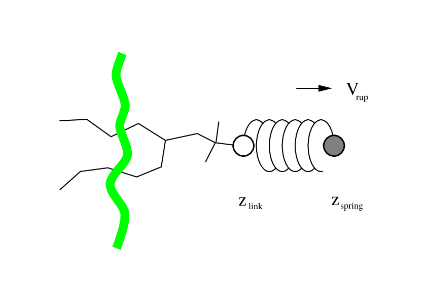 Fig. 36 Schematic picture of pulling a lipid out of a lipid bilayer with umbrella pulling. \(V_{rup}\) is the velocity at which the spring is retracted, \(Z_{link}\) is the atom to which the spring is attached and \(Z_{spring}\) is the location of the spring.