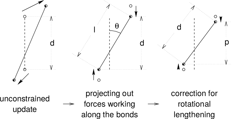 This first step does not set the real bond lengths to the prescribed lengths, but the projection of the new bonds onto the old directions of the bonds. To correct for the rotation of bond \(i\), the projection of the bond, \(p_i\), on the old direction is set to