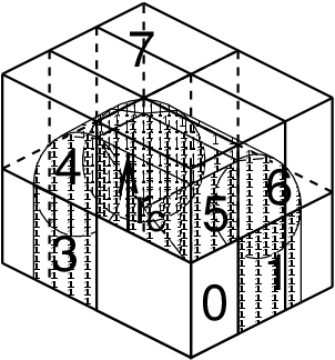 Fig. 11 A non-staggered domain decomposition grid of 3\(\times\)2\(\times\)2 cells. Coordinates in zones 1 to 7 are communicated to the corner cell that has its home particles in zone 0. \(r_c\) is the cut-off radius.