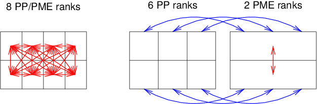 Fig. 14 Example of 8 ranks without (left) and with (right) MPMD. The PME communication (red arrows) is much higher on the left than on the right. For MPMD additional PP - PME coordinate and force communication (blue arrows) is required, but the total communication complexity is lower.