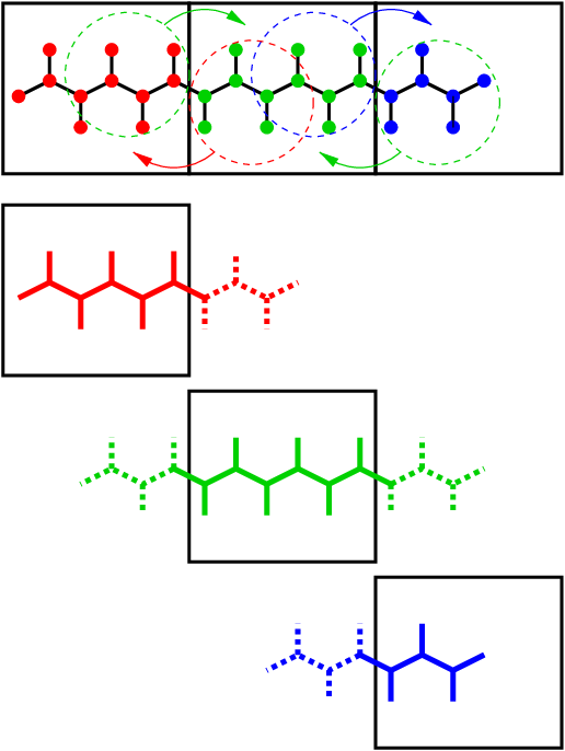 Since with domain decomposition parts of molecules can reside on different ranks, bond constraints can cross cell boundaries. This will not happen in GROMACS when update groups are used, which happens when only bonds involving hydrogens are constrained. Then atoms connected by constraints are assigned to the same domain. But without update groups a parallel constraint algorithm is required. GROMACS uses the P-LINCS algorithm 50, which is the parallel version of the LINCS algorithm 49 (see The LINCS algorithm). The P-LINCS procedure is illustrated in Fig. 13. When molecules cross the cell boundaries, atoms in such molecules up to (lincs_order + 1) bonds away are communicated over the cell boundaries. Then, the normal LINCS algorithm can be applied to the local bonds plus the communicated ones. After this procedure, the local bonds are correctly constrained, even though the extra communicated ones are not. One coordinate communication step is required for the initial LINCS step and one for each iteration. Forces do not need to be communicated.