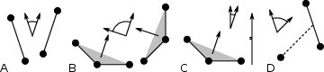 Fig. 56 Angle options of gmx gangle: A. Angle between two vectors. B. Angle between two planes. C. Angle between a vector and the \(z\) axis. D. Angle between a vector and the normal of a sphere. Also other combinations are supported: planes and vectors can be used interchangeably.¶