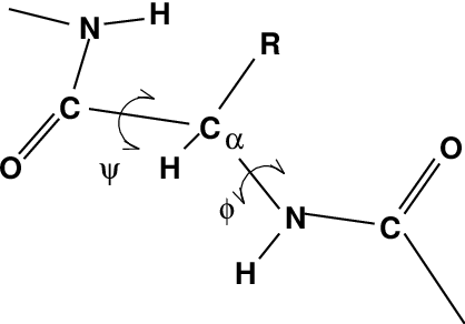 One other important analysis of proteins is the so-called Ramachandran plot. This is the projection of the structure on the two dihedral angles \(\phi\) and \(\psi\) of the protein backbone, see Fig. 60: