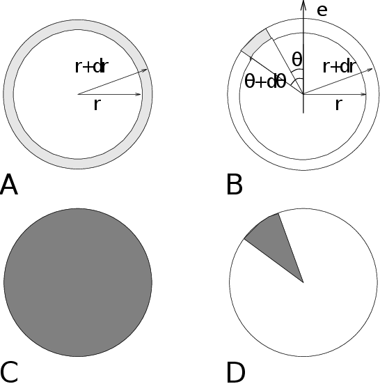 Fig. 52 Definition of slices in gmx rdf: A. \(g_{AB}(r)\). B. \(g_{AB}(r,\theta)\). The slices are colored gray. C. Normalization \(\langle\rho_B\rangle_{local}\). D. Normalization \(\langle\rho_B\rangle_{local,\:\theta }\). Normalization volumes are colored gray.¶