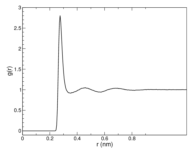 Usually the value of \(r_{max}\) is half of the box length. The averaging is also performed in time. In practice the analysis program gmx rdf divides the system into spherical slices (from \(r\) to \(r+dr\), see Fig. 52 A) and makes a histogram in stead of the \(\delta\)-function. An example of the RDF of oxygen-oxygen in SPC water 80 is given in Fig. 53