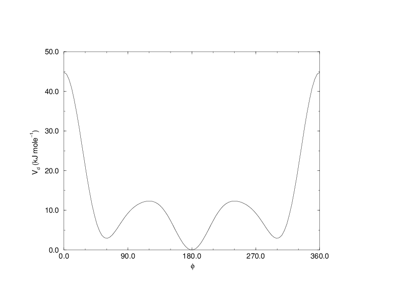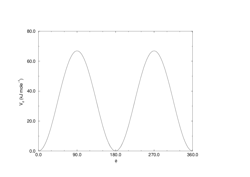 with the advantages of being a function of \(\cos\phi\) (no problems taking the derivative of \(\sin\phi\)) and of keeping the torsion angle at only one minimum value. In this case, the factor \(\sin^2\phi\) does not allow the dihedral angle to move from the [\(-180^{\circ}\):0] to [0:\(180^{\circ}\)] interval, i.e. it cannot have maxima both at \(-\phi_0\) and \(+\phi_0\) maxima, but only one of them. For this reason, all the dihedral angles of the starting configuration should have their values in the desired angles interval and the equilibrium \(\phi_0\) value should not be too close to the interval limits (as for the restricted bending potential, described in Restricted bending potential, at least \(10^{\circ}\) difference is recommended).