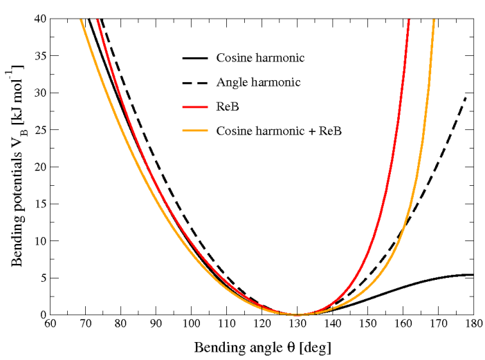 The wall of the ReB potential is very repulsive in the region close to \(180^{\circ}\) and, as a result, the bending angles are kept within a safe interval, far from instabilities. The power \(2\) of \(\sin\theta_i\) in the denominator has been chosen to guarantee this behavior and allows an elegant differentiation:
