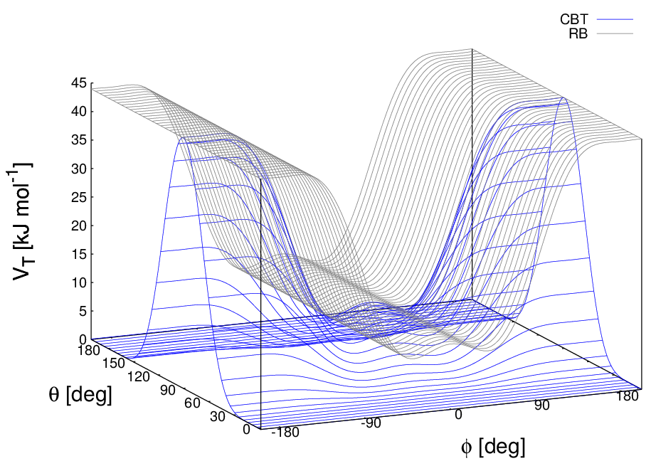 These two properties make the CBT potential well-behaved for MD simulations with weak constraints on the bending angles or even for steered / non-equilibrium MD in which the bending and torsion angles suffer major modifications. When using the CBT potential, the bending potentials for the adjacent \(\theta_{i-1}\) and \(\theta_i\) may have any form. It is also possible to leave out the two angle bending terms (\(\theta_{i-1}\) and \(\theta_{i}\)) completely. Fig. 28 illustrates the difference between a torsion potential with and without the \(\sin^{3}\theta\) factors (blue and gray curves, respectively).
