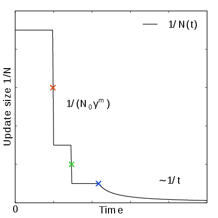 In the initial stage the update size is kept constant (by keeping \(N_n\) constant) until a transition across the sampling interval has been detected, a “covering”. For the definition of a covering, see (350) below. After a covering has occurred, \(N_n\) is scaled up by a constant “growth factor” \(\gamma\), which by default has the value of 2. Thus, in the initial stage \(N_n\) is set dynamically as \(N_{n} = \gamma^{m} N_0\), where \(m\) is the number of coverings. Since the update size scales as \(1/N\) ( (347)) this leads to a close to exponential decay of the update size in the initial stage, see Fig. 41.