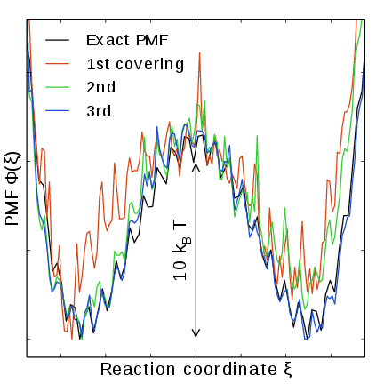 Note that quantity of interest to the user is not \(F(\lambda)\) but the PMF \(\Phi(\xi)\). \(\Phi(\xi)\) is extracted by reweighting samples \(\xi(t)\) on the fly 137 (see also section Reweighting and combining biased data) and will converge at the same rate as \(F(\lambda)\), see Fig. 41. The PMF will be written to output (see section Limitations).