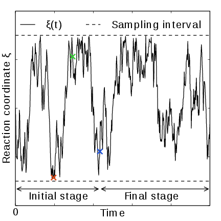 Monitoring the transition rate of \(\xi(t)\), across the sampling interval is also advisable. For reliable statistics (e.g. when reweighting the trajectory as described in section Reweighting and combining biased data), one would generally want to observe at least a few transitions after having exited the initial stage. Furthermore, if the dynamics of the reaction coordinate suddenly changes, this may be a sign of e.g. a reaction coordinate problem.