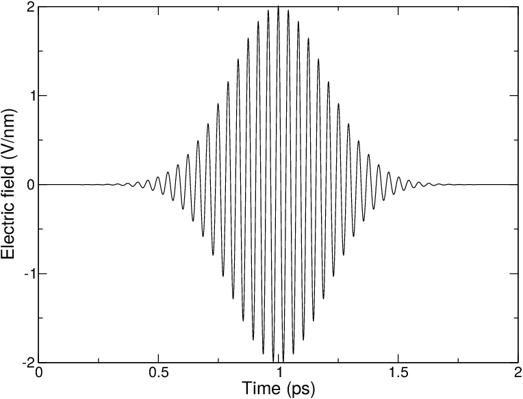 yields an oscillating electric field with \(E_0\) = 2 V/nm, \(\omega\) = 150/ps and \(t_0\) = 5 ps. Finally