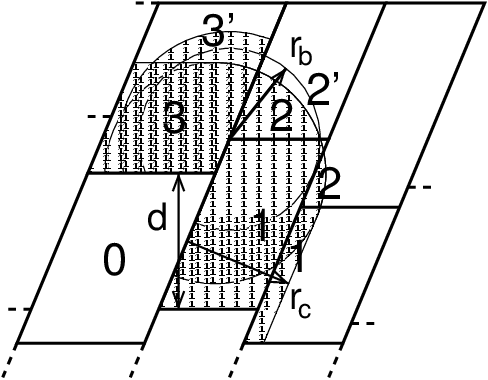 Fig. 12 The zones to communicate to the rank of zone 0, see the text for details. \(r_c\) and \(r_b\) are the non-bonded and bonded cut-off radii respectively, \(d\) is an example of a distance between following, staggered boundaries of cells.