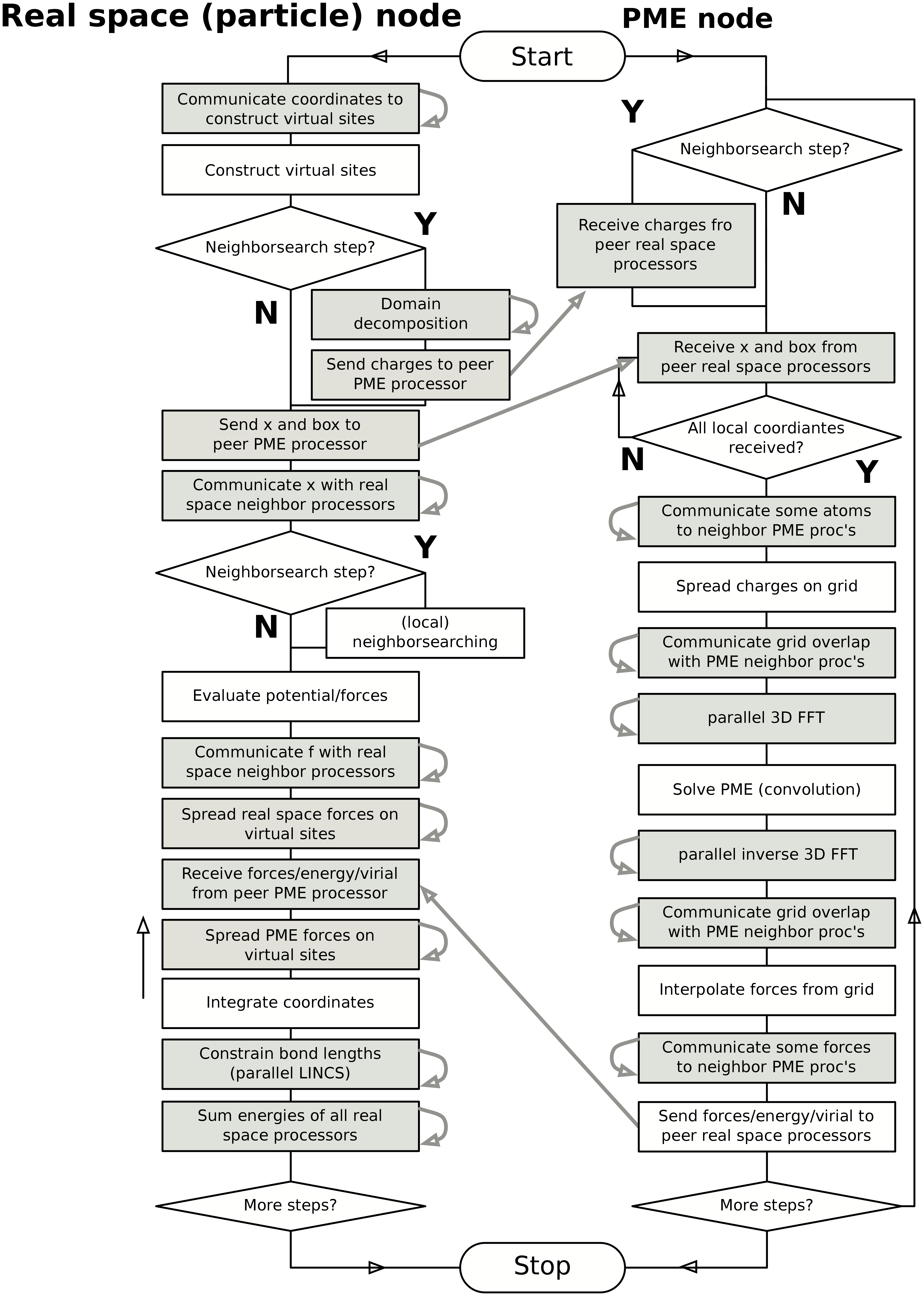 Fig. 15 Flow chart showing the algorithms and communication (arrows) for a standard MD simulation with virtual sites, constraints and separate PME-mesh ranks.